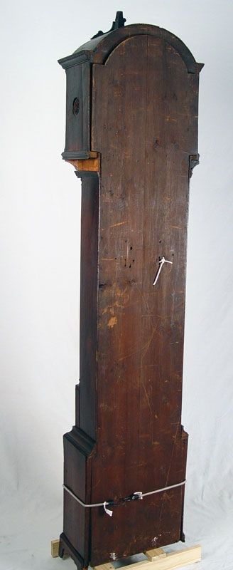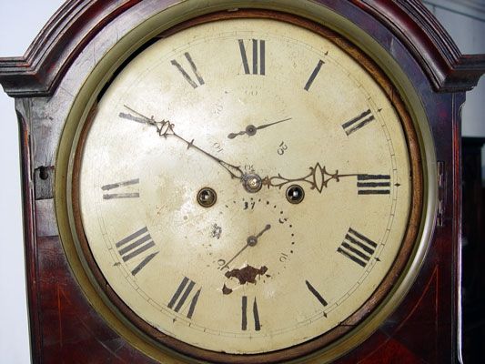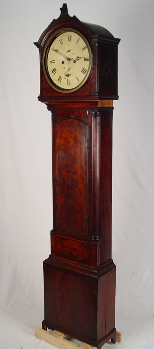 19TH C. SCOTTISH DRUMHEAD LONGCASE GRANDFATHER CLOCK: Early 19th century mahogany case and works. 13'' painted metal face with seconds and date movement. Key and pendulum works. Measures 83'' high x 17 1/2'' wide x 8 1/2'' deep. Numerous condition issues to case. MUST CALL FOR CONDITION.