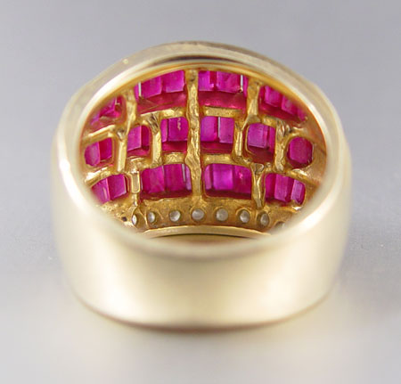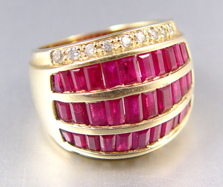 14K RUBY AND DIAMOND RING: 14K yellow gold ring contains 32 baguette cut rubies. Weight: 4.00 Ct. Approx. Rated SI in clarity (Type II), slpR in Hue, 4 in Tone and 3-4 in Saturation. 18 round brilliant cut diamonds. Weight: .33 Ct. Approx. Rated VS in clarity and H-I in color. The rubies are channel set. The diamonds are bead set. Weight: 13.8 grams. Size: 7. Sold with current Florida Diamond Appraisers GIA graduates appraisal for $2850.