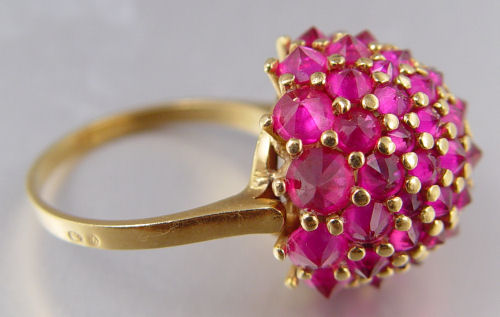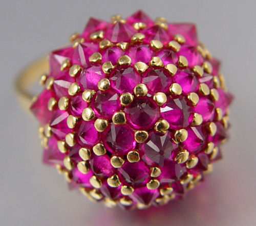 FRENCH 18K RUBY CLUSTER RING: High profile 18K yellow gold dome ring contains approx. 52 round mixed cut synthetic rubies. Weight: 8.00 ct. approx. The rubies are prong set with the pavilions up. Weight: 13.0 grams. Size: 9 French hallmarks.