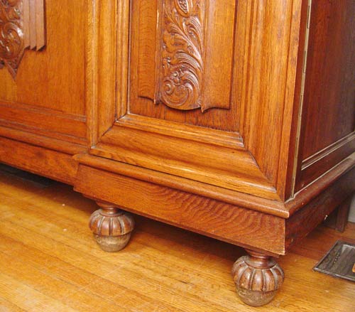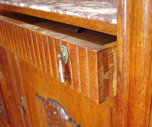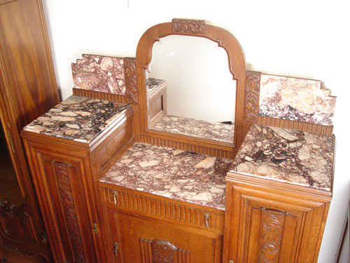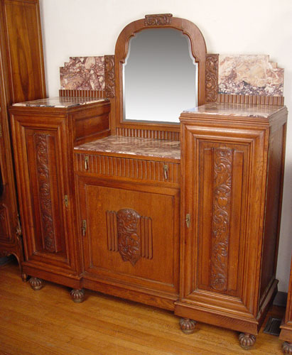OAK ENGLISH DECO SIDEBOARD CABINET: Marble back splash flanks a shaped and beveled mirror. Cabinet and drawers between 2 marble top towers. Companion piece at next lot 162. Measures 72'' high x 66'' wide x 20 1/4'' deep