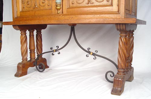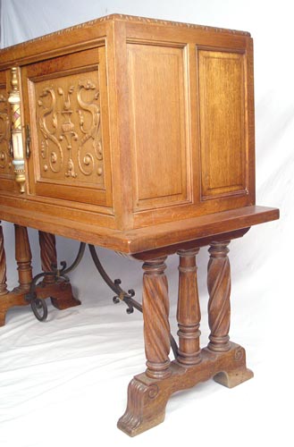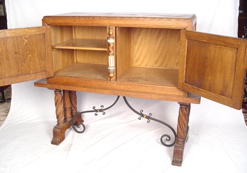 CARVED OAK AND IRON SIDE CABINET: Turned and polychrome semi column separated a pair of stylized gryphon carved doors. Iron stretcher. For a pair please see lot 169. Measures 43 1/4'' high x 50 1/2'' wide x 21 1/2'' deep.