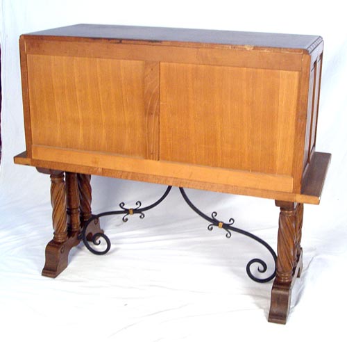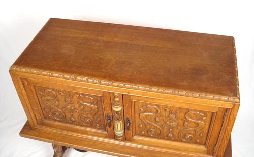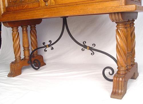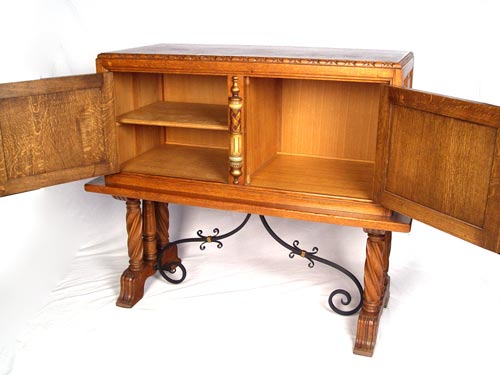 CARVED OAK AND IRON SIDE CABINET: Turned and polychrome semi column separated a pair of stylized gryphon carved doors. Iron stretcher. For a pair please see lot 168. Measures 43 1/4'' high x 50 1/2'' wide x 21 1/2'' deep.