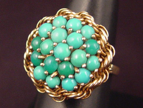 14K TURQUOISE RING: 14K yellow gold ring contains 19 4.50 mm round cabochon cut pieces of turquoise. The turquoise is blue and blue/green. The turquoise is prong set. Rope bezel. Weight: 10.1 grams. Size 6.