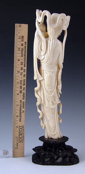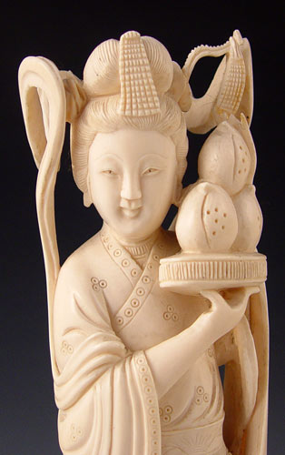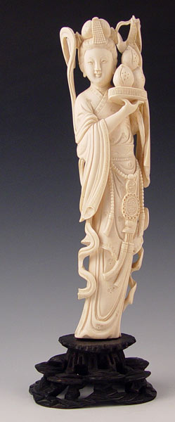 CHINESE CARVED IVORY FIGURE WOMAN HOLDING FRUIT: Carved from single piece, depict woman in ceremonial dress holding tray of fruit, on carved wood stand. Figure measures 11 1/4'' high, 13 1/4'' high overall. Please note repair just above the fruit.