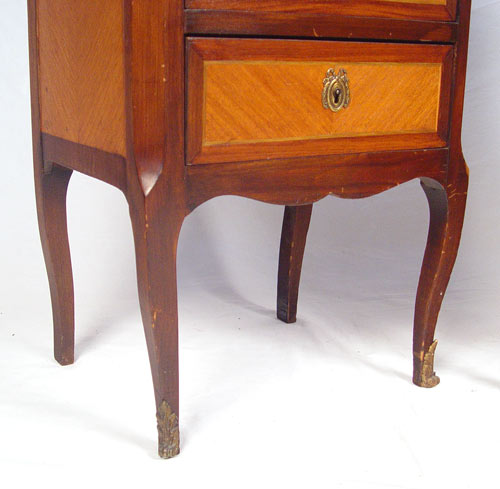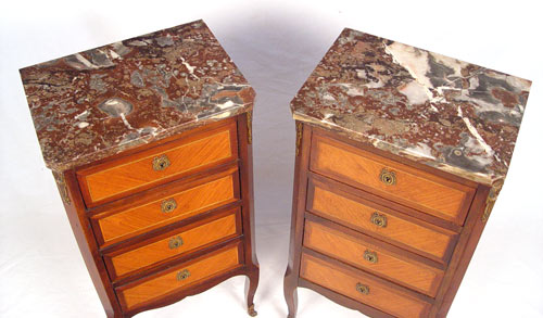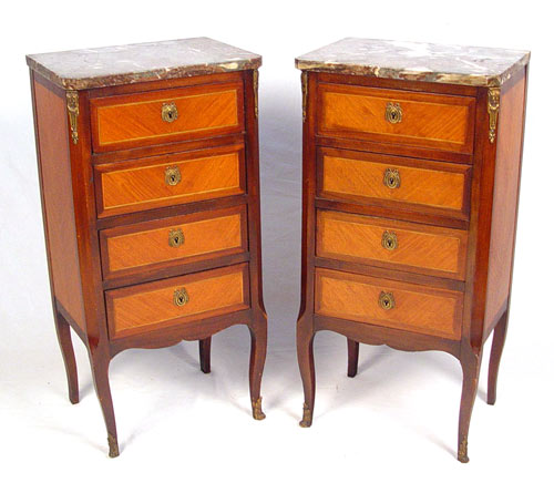 PAIR FRENCH MARBLE TOP COMMODES: Early 20th C. Each with 4 locking drawers and key. Measures 32 1/2'' high x 16 1/8'' wide x 12'' deep