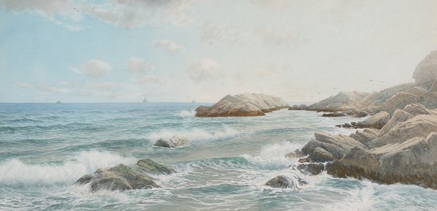 GAY, George Howell, (American, 1858-1931): ''Lodge's Cove, Nahant Mass.'', W/C, 9 1/2'' x 19 1/2'', signed, dated 1902, painted gesso frame, 24'' x 44'' Est. $1200/1800**
