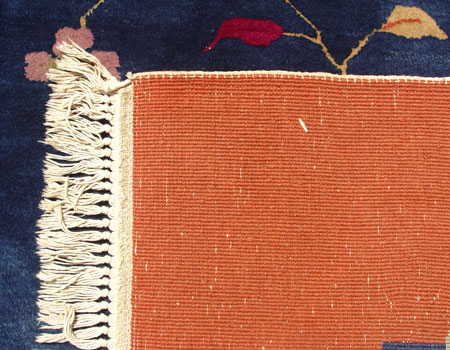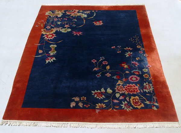 CHINESE NICHOLS CARPET: Approx. 9 x 12. Blue field with floral design, peach border.