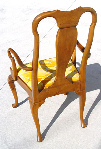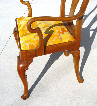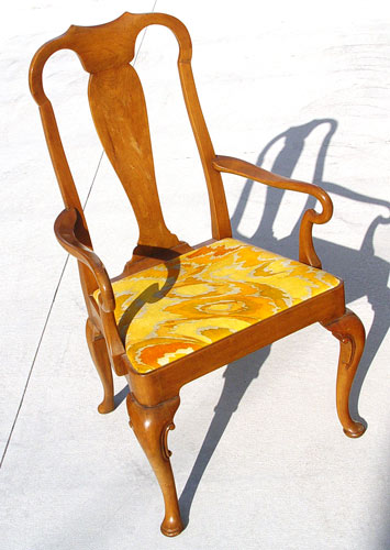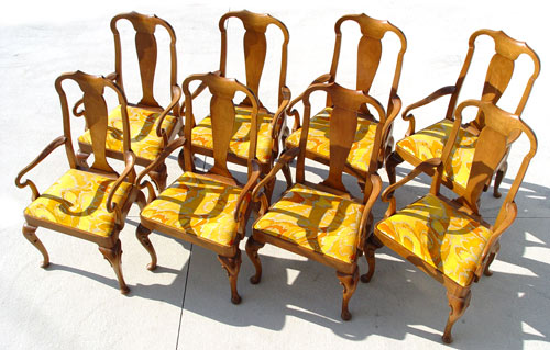 SET OF 8 BAKER FURNITURE QUEEN ANNE STYLE ARM CHAIRS: Chairs 1645. Center splat under a curved top rail, arms ending in curved hand holds. Carved cabriole legs. Measures 41 3/4'' high x 24 1/2'' hide x 21'' deep.