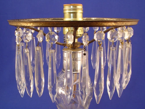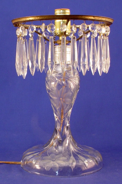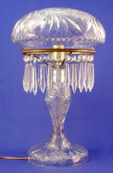 CUT GLASS LAMP attrib. PAIRPOINT: Cut flower design on base and matching shade. Shade has a 8'' rim. Lamp is 17 1/2'' high.