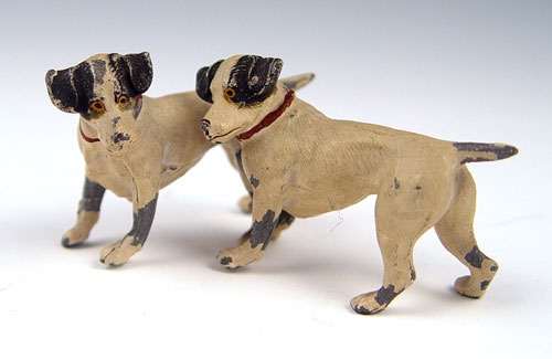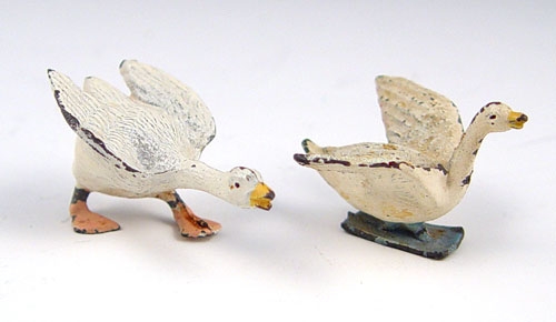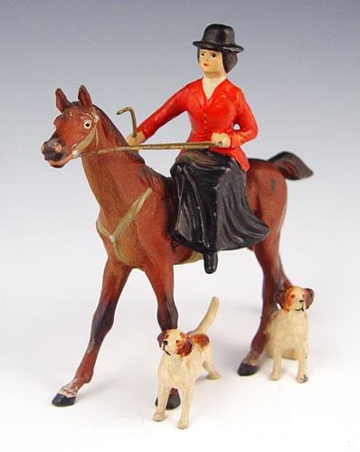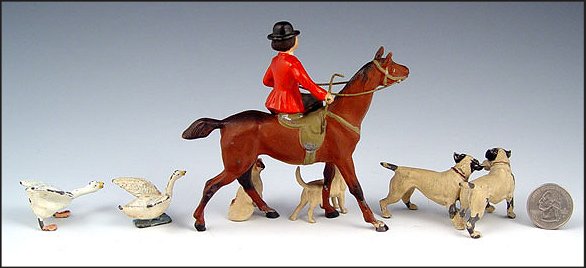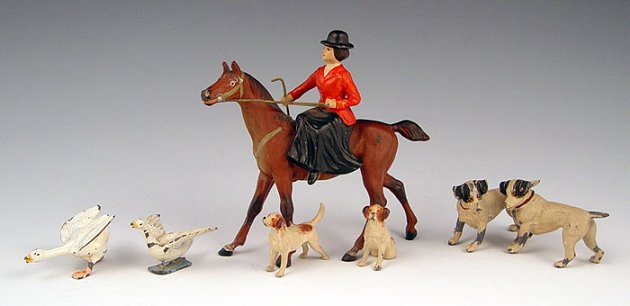 COLD PAINTED AUSTRIAN MINIATURES: To include woman on horse riding side saddle with dogs (4'' high), 2 geese running (7/8'' high), pair of dogs (1 3/8'' high). Horse is marked Germany on belly. Please note paint fleck loss on all pieces.