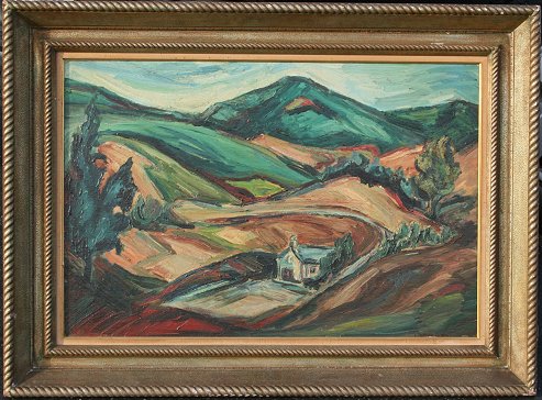 KRUGMAN, Leo, (American, 20th C.): Modernist Landscape, OIL/B, 24'' x 36'', signed, dated '62 verso, heavy gilded frame, 33'' x 46''. Est. $600/800**