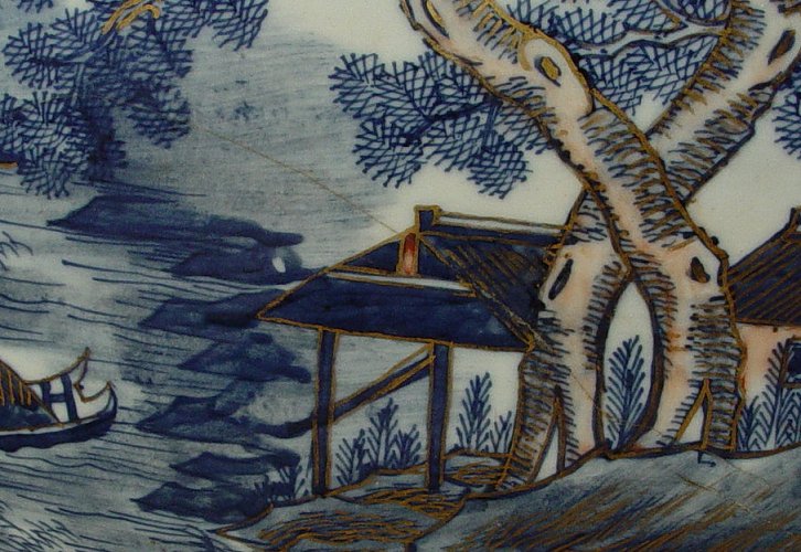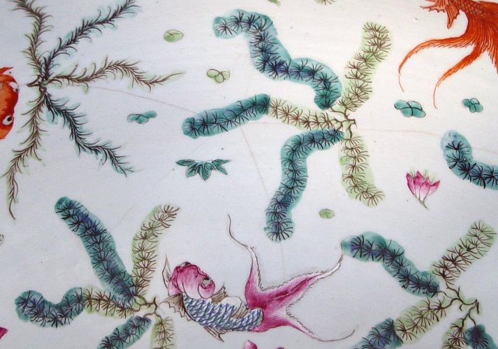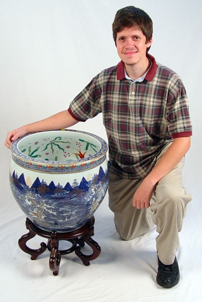 EARLY 20TH C. CHINESE PORCELAIN FISH BOWL: Cobalt scenic landscape exterior, interior decorated bubble eye goldfish. Bowl measures 16'' high x 18 3/8'' top dia. Stand 9 3/4'' high. Please note hairline cracks.