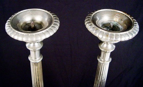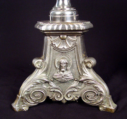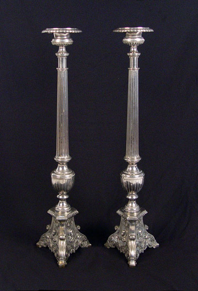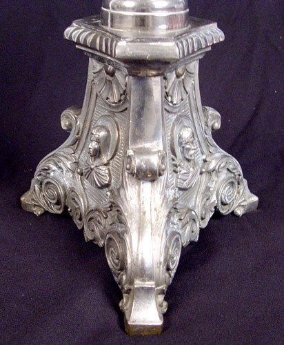 LARGE NICKEL PLATED ALTAR TORCHIER CANDLE HOLDERS: Religous motif, 39'' high x 9 1/2'' base.