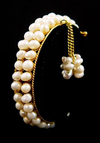 20K CULTURED PEARL BANGLE BRACELET: 20K yellow gold twisted wire bangle with double row of 5.00-6.00 mm freshwater cultured pearls. Hanging charm with cluster of pearls. The pearls are wired to the bracelet. Weight: 27.4 grams. 2.25'' diameter.