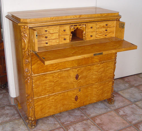 TURN OF THE CENTURY BIEDERMEIR TYPE CHEST OF DRAWERS: Top drawer falls into desk with pigeon holes. Carved stiles, canted corners on a 4 drawer chest. 40 1/2''h. x 40'' x 20 1/2''.