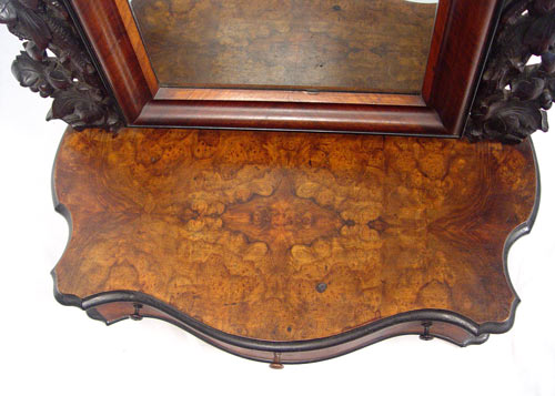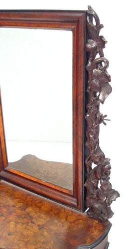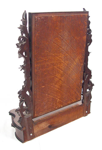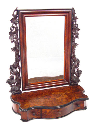 19TH C CARVED MAHOGANY SHAVING MIRROR: Finely carved naturalistic leaf design on the support arms. Mirror over a serpentine front base with one drawer. Original back. Measures 24'' high x 19 1/2'' wide x 9 1/4'' deep. Mirror measures 16 1/2'' x 9 1/2''.