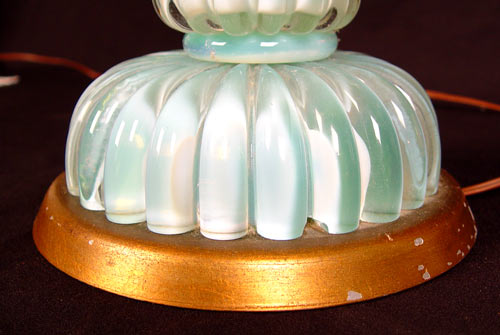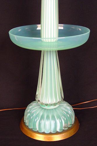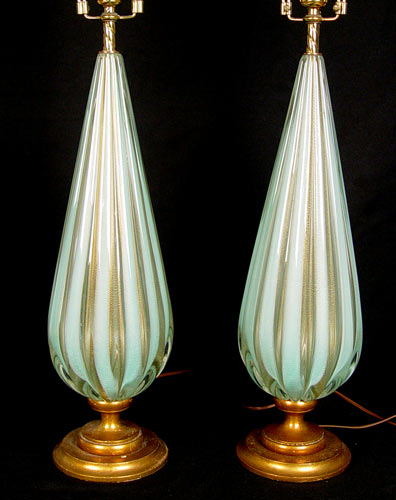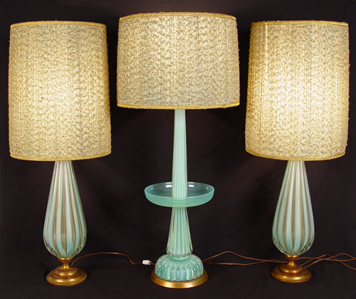 3 VINTAGE MURANO ART GLASS LAMPS: Original shades. Pair measures 31'' high overall, 20 1/2'' base height without shades, 6 1/2'' approx diameter. Shades 18'' high x 14 1/2'' dia. Single lamp measures 38 1/2'' overall, 28 1/2'' base height without shade, 10'' approx diameter. Shade measures 12'' high x 17'' dia.