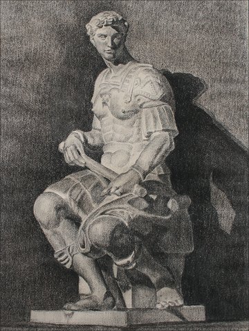 NEOCLASSICAL CHARCOAL RENDERING OF MICHELANGELO'S GIULIANO DE MEDICI: 22 1/2'' x 17'' monogrammed, carved frame with some minor damage, 30'' x 24''.