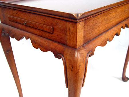 KITTINGER COLONIAL WILLIAMSBURG TEA TABLE: Pattern CW8, impressed brand and paper label. Mahogany tea table with candle slides, scalloped apron and graceful cabriole legs. Style is circa 1735-1750. Measures 26 1/2'' high x 30'' wide x 18 1/2'' deep.