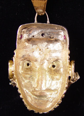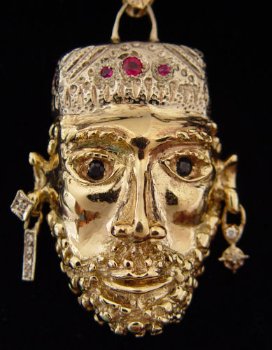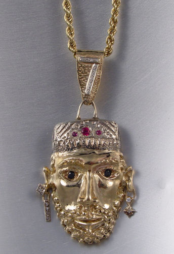 14K FIGURAL PENDANT & CHAIN: 14K yellow gold pendant depicting a man's head containing 18 round single cut and full cut diamonds, approx. .15 Ctw. Also 5 round mixed cut rubies, approx. .40 Ctw. and 2 round mixed cut sapphires, approx. 30 Ctw. The colored stones are deep set. The diamonds are prong set. Approx. 3'' x 1.75''. Sold with the 14K yellow gold hollow rope chain with spring ring clasp, 24''. Pendant and chain weight is 61.4 grams.
