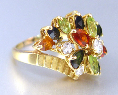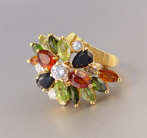 14K .70 CTW DIAMOND AND MULTI COLOR STONE RING: 14K yellow gold ring contains 5 round brilliant cut diamonds. Weight: .70 Ct. Approx. Rated VS1-VS2 in clarity and H-I-J in color. 14 marquise and pear shaped mixed cut stones, Orange, reddish orange, dark green and light green in color. All stones are prong set. Weight: 10.1 grams. Size: 7