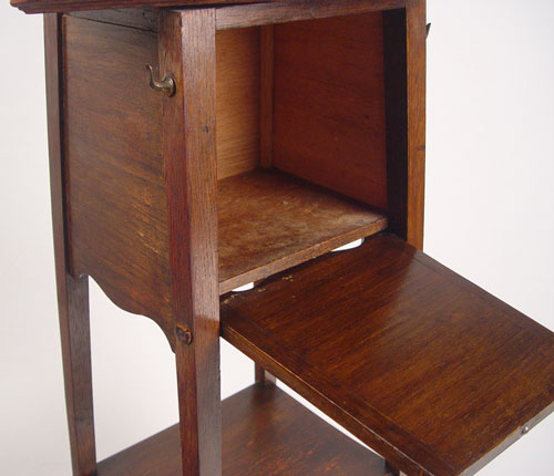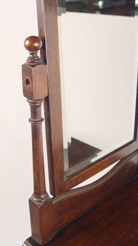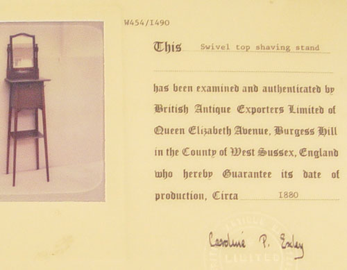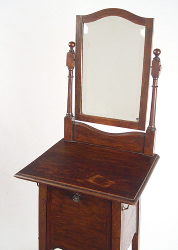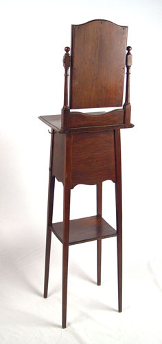 19TH C ENGLISH ARTS & CRAFTS SWIVEL TOP SHAVING STAND: Beveled mirror hangs between arms, top of stand pivots, front falls open for storage. Sold with certificate by British Antique Exporters Limited. Measures 57'' high x 14'' wide x 12'' deep.