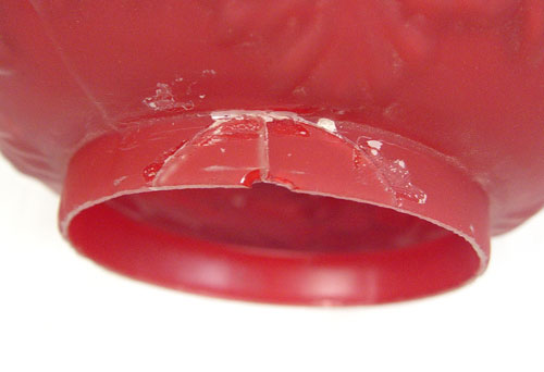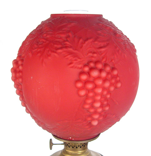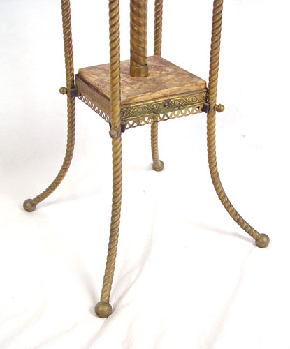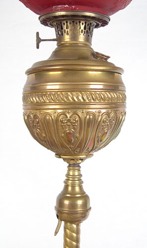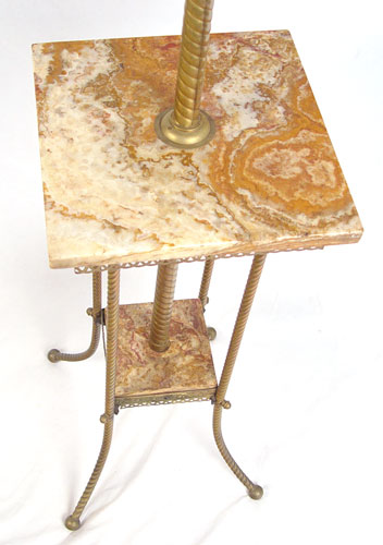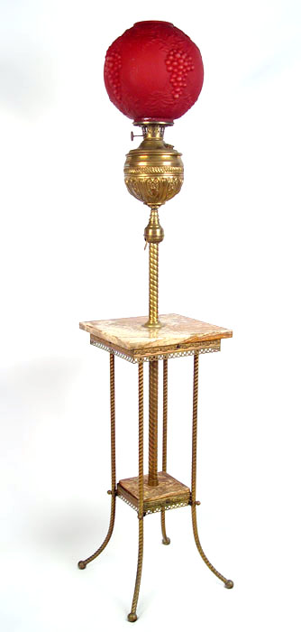 BRADLEY & HUBBARD PIANO FLOOR LAMP: Brass and marble pedestal side table with lamp. Marked B & H on oil cap. Original condition, not electrified. Note chip to red glass dome shade. Measures 52'' high x 12'' square at pedestal.