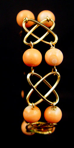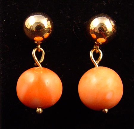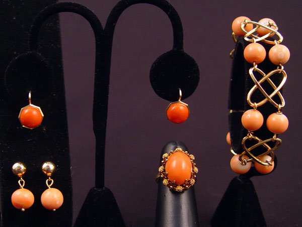 SALMON AND PINK 14K CORAL JEWELRY: Lot of 14K yellow gold coral jewelry to include one ring, one bracelet and two pair of earrings. 1) BRACELET of 10 salmon and pink coral 9.50 mm beads, 8''. 2) Ring, 16.00 x 12.00 mm cabochon salmon coral, ring size 6 3) Post earrings with gold ball and dangle coral bead. 4) Lever back earrings. Weight: 44.5 (with coral) gold weight is approx. Gold weight is approx. 20 grams.