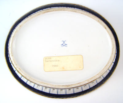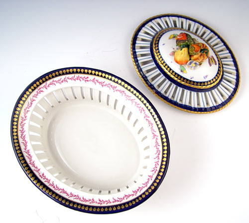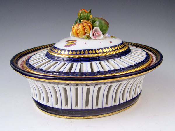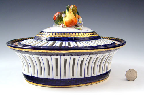 SEVRES FRENCH PORCELAIN POTPOURRI: Reticulated body and lid, the lid being surmounted with a gathering of fruit and flowers. Hand painted moths and butterflies surround the fruit. Mark under glaze. 6''h, 9 1/2'' dia.