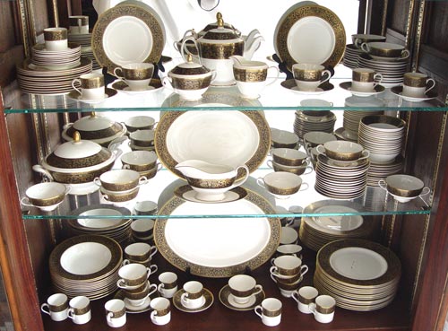 MINTON ''GRANDEE'' FINE CHINA SERVICE: 149 pieces to include 14 dinner plates (10.5''), 13 salad plates, 14 bread plates, 12 low soup bowls, 13 dessert bowls, 12 cream soup bowls, 14 tea cups, 24 saucers or underplates for cream soups, 14 demi-tass cups, 13 demi saucers. SERVING PIECES include 16' platter, 13.25'' platter, tea pot with lid, covered sugar, cream pitcher, and gravy boat.