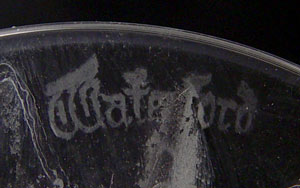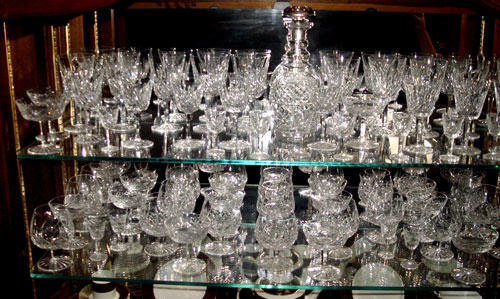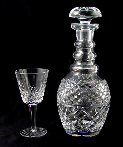 WATERFORD LISMORE CRYSTAL: 54 pieces to include 10 water goblets (6 7/8''), 12 champagne / tall sherberts, 12 brandy, 8 clarets, and 12 cordials. Also included is a spirits decanter of unknown maker.