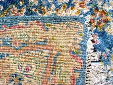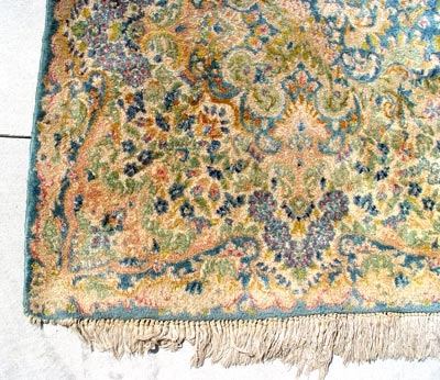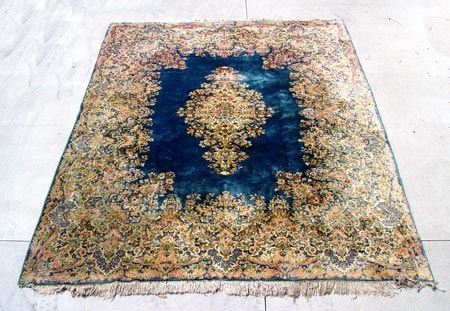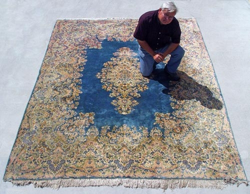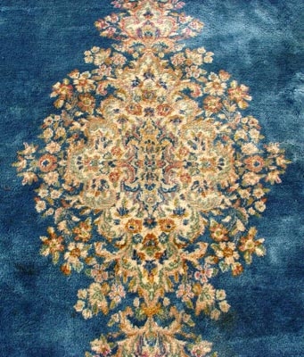 SEMI ANTIQUE BLUE FIELD KIRMIN RUG: Measures 11' 8'' x 8' 8''. Note fringe damage and fading.
