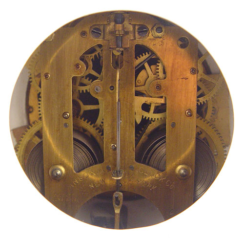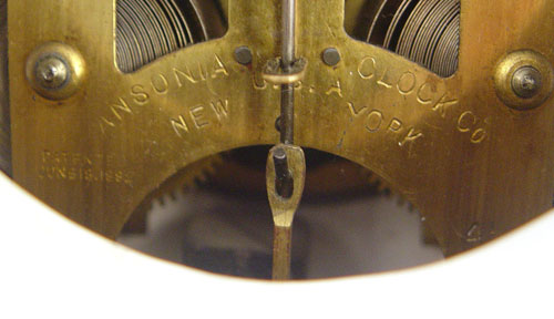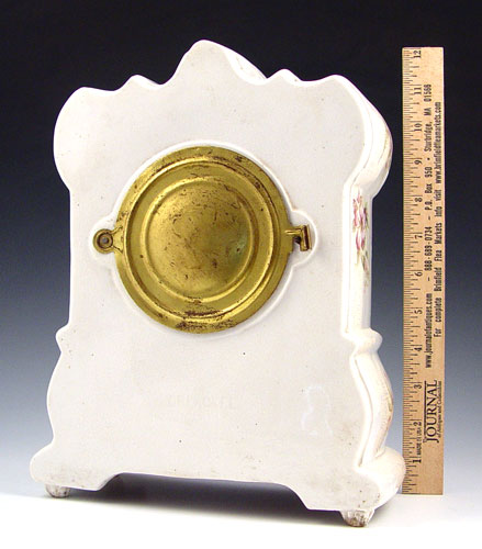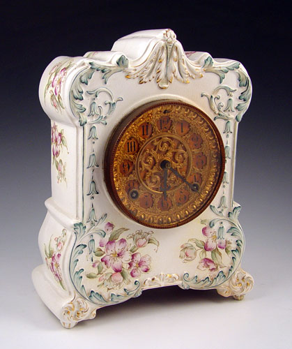 ANSONIA CHEROKEE PORCELAIN CASE CLOCK: Porcelain case with hand painted floral designs, some loss to gold decoration. Impressed ''Cherokee'' mark on back. Paper face dial with metal decoration over face. Key and pendulum works marked Ansonia Clock Co. New York. Note crazing, back plate held on with replacement nails. Missing key. Measures 11 1/2'' high x 9'' wide x 4 3/8'' deep.