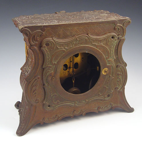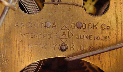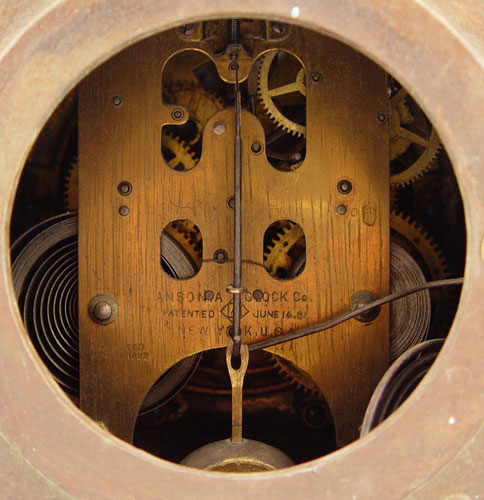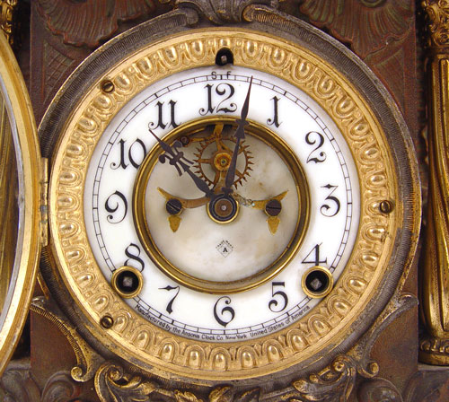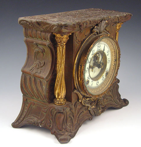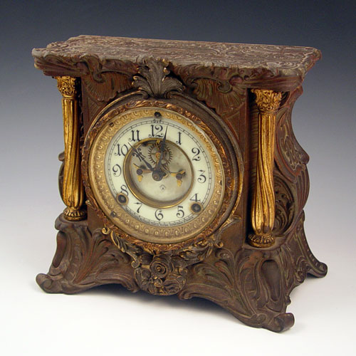 ANSONIA CAST IRON MANTLE CLOCK: Heavy cast iron with 2 gilt metal columns. Beveled glass crystal. Porcelain face with open escapement. Marked Ansonia Clock Co. on face and works. Missing key. Measures 9 1/4'' high x 11 5/8'' wide x 5 1/4'' deep.