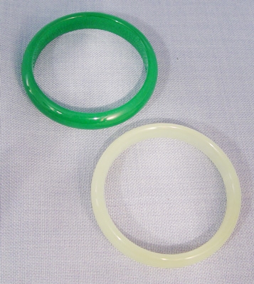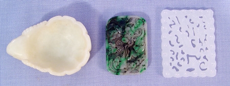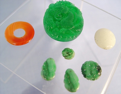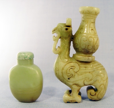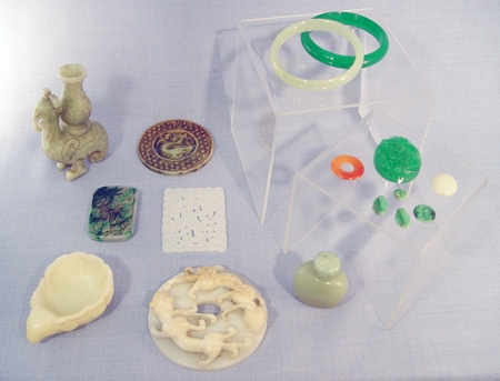 10 PIECE GROUP CARVED JADE AND STONE: Jade items to include, 2 bangle bracelets, snuff bottle, 4 plaques and a ram shaped wine cup. The beastly vase is 4 1/2''h., the dragon pendant is 1 3/4'' x 1 3/8'' oval. Sold with six small carved beads - green, white & orange.