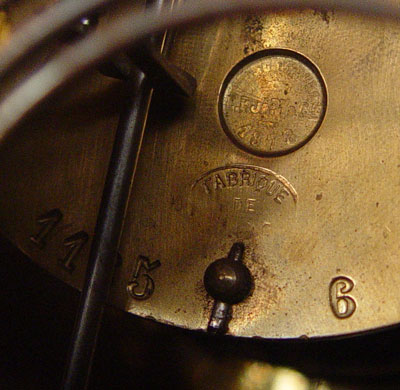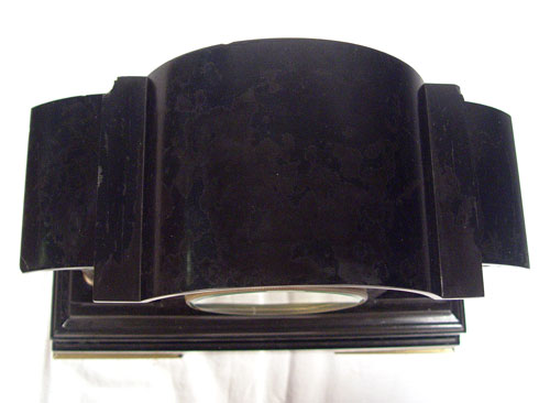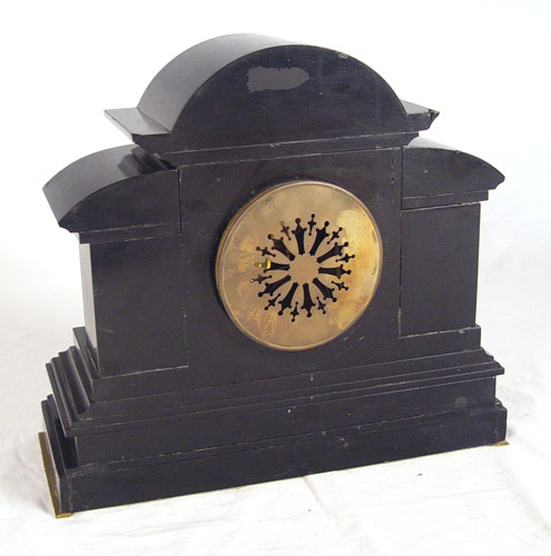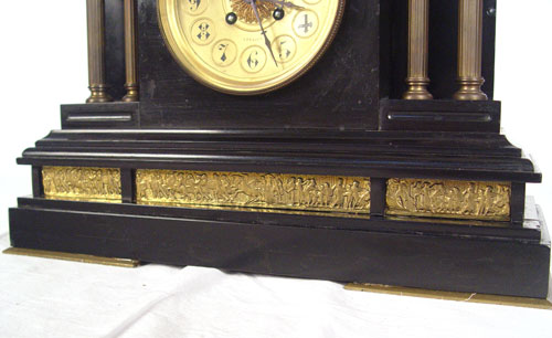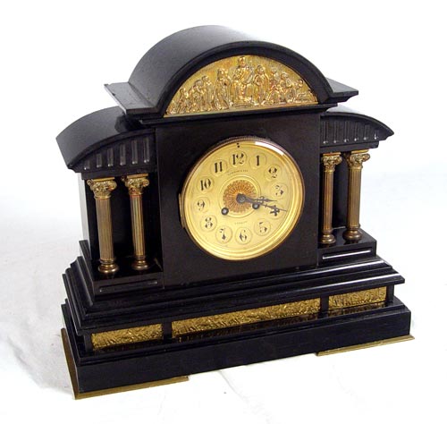 1878 SPIRIDION & SON BLACK ONYX MANTLE CLOCK: Heavy black onyx case with brass relief friezes of Roman scenes. 4 brass columns. Marked on 5 1/2'' brass face Spiridion & Son Cardiff. Key and pendulum works marked L.P. Japy et Cie 1878. Measures 14 7/8'' high x 16 5/8'' wide x 6 1/2'' deep. Please note ships and repairs to onyx, areas of loss to finish, missing key.