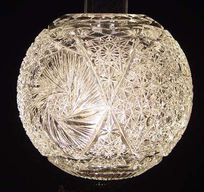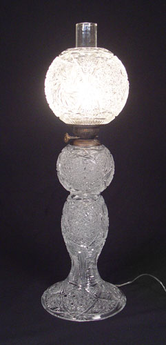 BOHEMIAN CUT GLASS BANQUET LAMP: Cut glass globular shade and pedestal base. 29'' high x 9 1/2'' base dia. Will need to rewire for safety.