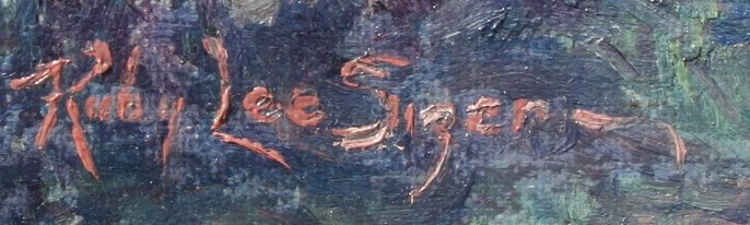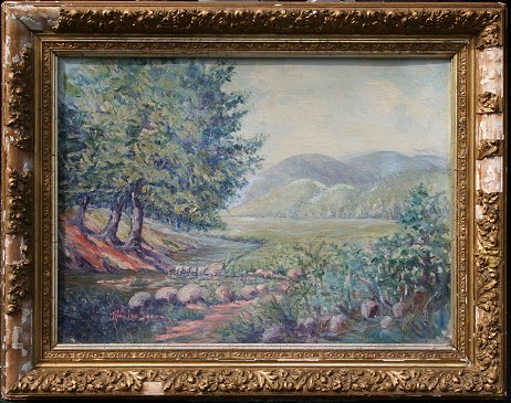 IMPRESSIONIST LANDSCAPE SIGNED RUBY LEE SUGEN?: OIL/CB, 18'' x 24'', gilded gesso frame with wear and missing gesso, 24'' x 30''.