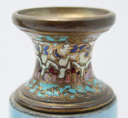 PAIR OF MINIATURE CHAMPLEVE MOUNTED PORCELAIN PORTRAIT VASES: Brass plate under the onyx bases are hallmarked with a hammer and M mark. 6''h.