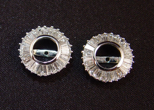 14K WHITE GOLD DIAMOND EARRING JACKETS: 14K white gold earring jackets contain 52 tapered baguette cut diamond, approx. 2.00 ctw. Rated VS in clarity and F-G in color. The diamonds are channel and prong set. Weight: 4.1 grams. Circle design will compliment your gemstones, diamond solitaires or pearl stud earrings. Sold with current Florida Diamond Appraisers GIA graduates appraisal for $4,750.