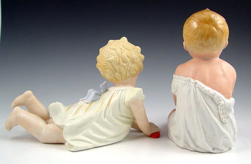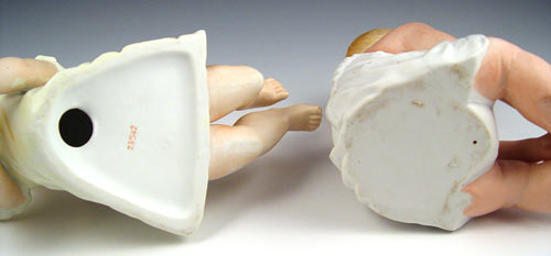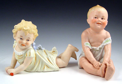 LARGE HEUBACH PIANO BABY: Impressed mark, 8''h. Sold with a Japanese made porcelain piano baby, 9'' long.