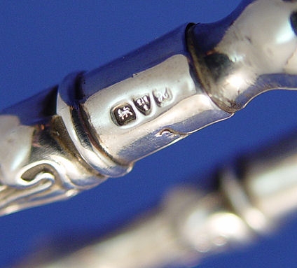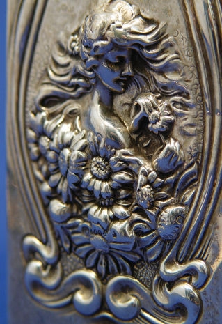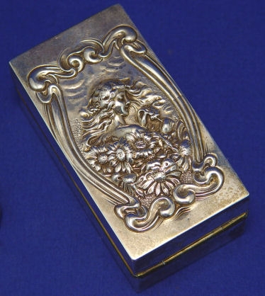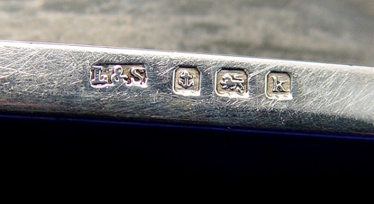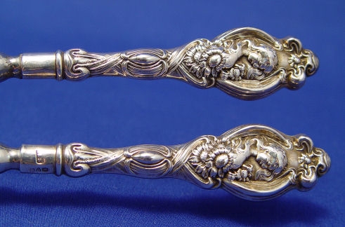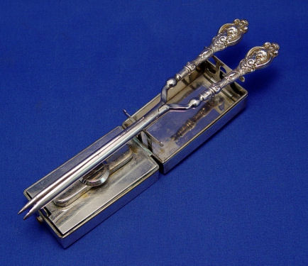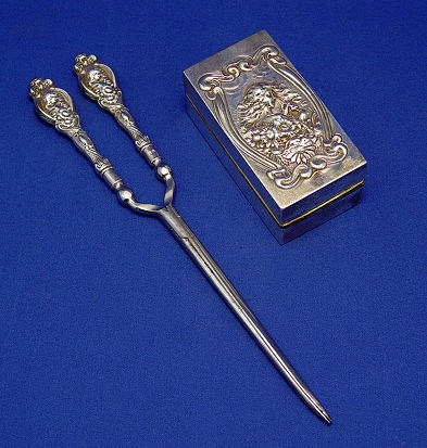 TURN OF THE CENTURY ENGLISH SILVER CURLING IRON: Ornately embossed curling iron and folding fluid box. Hallmarks to box/stand indicate Birmingham Ca 1905, maker's mark L&S, 1 3/4''h x 4'' x 2''. Curling iron is hallmarked Chester ca 1908, maker L&S, measures 10 1/2''l.