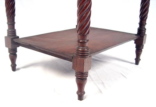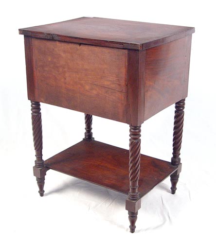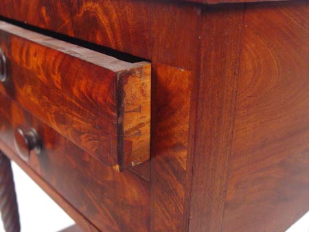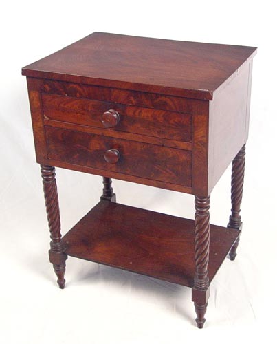 19th C MAHOGANY 2 DRAWER WORK TABLE: Nicely grained mahogany veneers, spiral turned legs, lower shelf under the two drawers. Measures 27 3/4'' high x 20 3/4'' wide x 16 1/4'' deep.