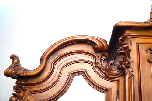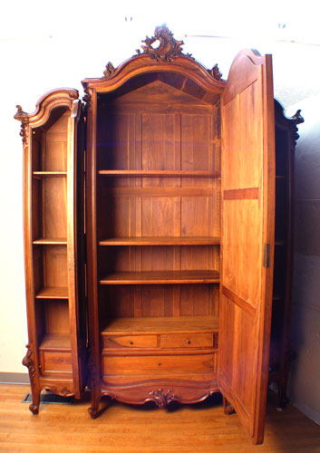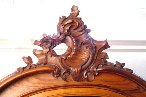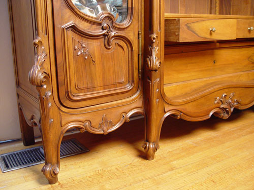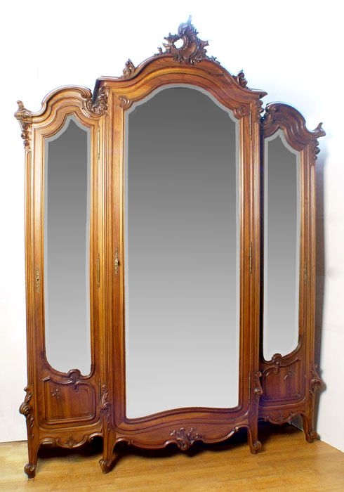 CARVED FRENCH, MIRROR FRONT 3 DOOR ARMOIRE: 3 sections under a carved crest. Interior with shelves and drawers. The side door mirrors open inward to create a 3-way mirror. Measures 105 1/2'' high x 76 3/4'' wide x 21'' deep.