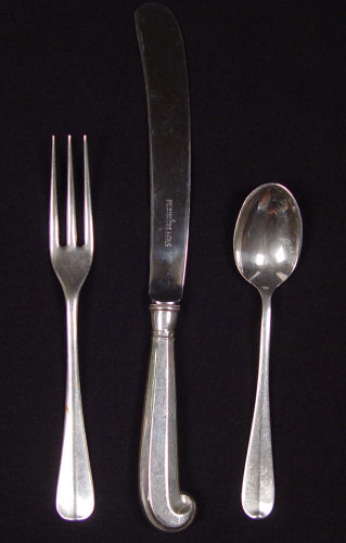 STIEFF COLONIAL WILLIAMSBURG QUEEN ANNE STERLING FLATWARE: 118 pieces in the Colonial Williamsburg Queen Anne pattern by Stieff to include 13 forks (7 3/4''), 12 salad forks (6 1/2''), 12 cocktail forks (5 3/8''), 16 teaspoons (5 3/4''), 11 soup spoons (6 3/4''), 12 iced tea spoons (7''), 12 demitasse spoons (4 1/2''), 3 pistol knives (10 1/8''), 8 pistol knives (9 3/4''), 4 pistol knives (8 1/2''), 12 pistol butter knives (6 5/8''), serving spoon (8 3/8''), meat fork (8 3/8''). Approx. 124.3 troy oz.