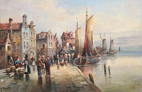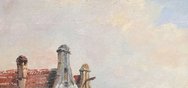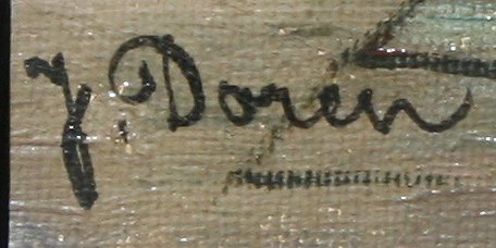 LARGE AMSTERDAM SCENE OIL/C/B SIGNED J. DOREN: 31'' X 31'', gilded frame, 28'' x 39''. Laid on board, cracklure, some paint fleck with missing paint and flaking with inpaint.