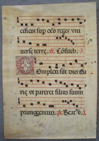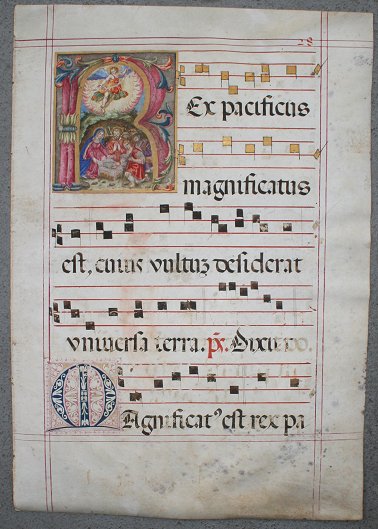 ILLUMINATED SHEET MUSIC ON VELLUM: Unframed, 24'' x 17'', inset miniature repaint is 19th c, the sheet is most likely 16th c. or earlier. Abrasions, staining and foxing, sold as is. Est. $300/500**