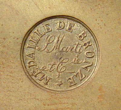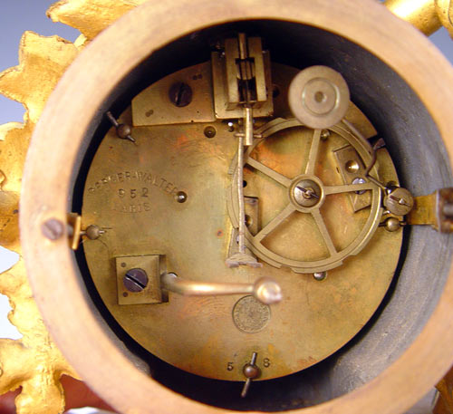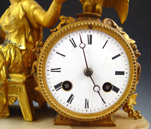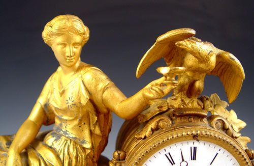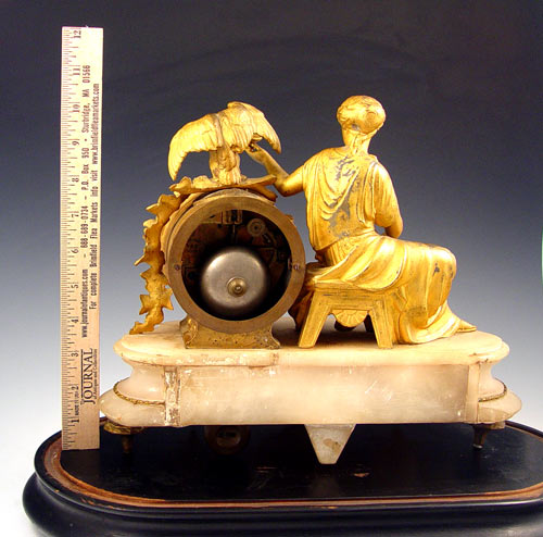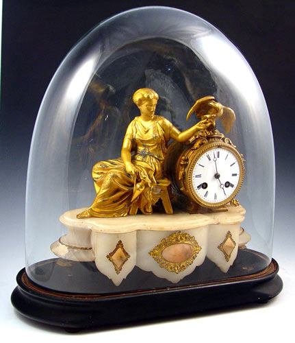 L. MARTI FIGURAL CLOCK UNDER GLASS DOME: Fine detail cast spelter with dore finish figure of woman seated and eagle. Porcelain face with roman numerals, note hairline crack. Marked on works L. Marti bronze medallion and Berger-Walter 952 Paris. Onyx base with marble and metal decoration. Comes with dome glass cover and wood base. Clock measures 10 1/4'' high x 12'' wide x 5'' deep. Glass dome and base measures 17'' high x 16 1/2'' wide x 7'' deep. Please note chips, and repairs to onyx, loss of finish, no key.