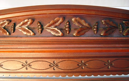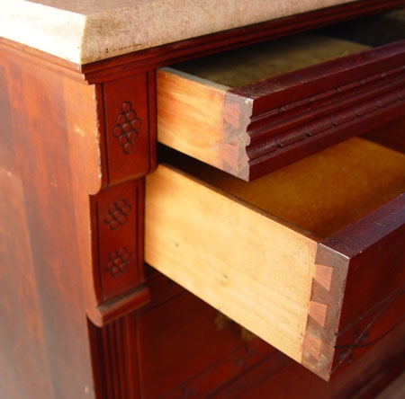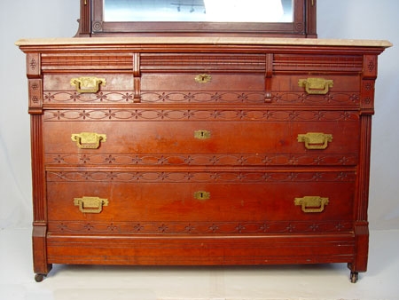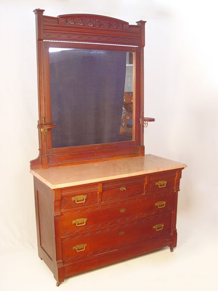 VICTORIAN MARBLE TOP DRESSER WITH MIRROR AND SECRET DRAWER: Carved crest over swivel mirror, candle shelves. Three drawers over 2 full length drawers. Two side top drawers have secret drawer. Pink marble top. 79'' high to top of mirror x 46'' wide x 20'' deep.