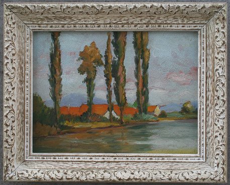 FRENCH LANDSCAPE OF TREES ALONG CANAL: 9'' x 12'', unsigned, painted white frame, 12'' x 15''.